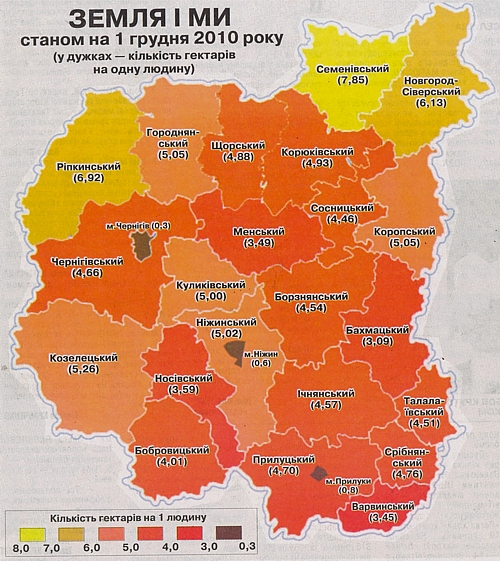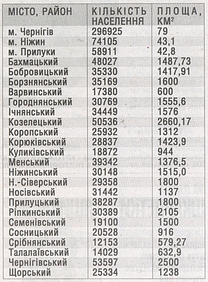 Населення Чернігівської області на 1 грудня 2010 року становило 1099223 особи. Площа області — 31,9 тисячі квадратних кілометрів, або три мільйони 190 тисяч гектарів. На одну людину припадає 2,9 гектара. Це в середньому, найменше землі припадає на одного чернігівця — 266 квадратних метри. Найбільше — на жителя Семенівського району — 7,85 гектара! Детальнішу інформацію про густоту населення по районах та великих містах дивіться на карті.