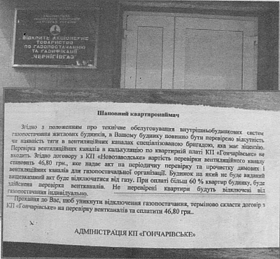 — Нам прислали сообщение, что в домах №№ 70, 84, 86 будет проводиться проверка вентиляционных каналов, для этого нужно в пятидневный срок оплатить отмеченную сумму, для меня это 46 гри 80 коп., — рассказала нам жительница Гончаровского, которая побоялась назвать свое имя (чтобы после этого не остаться без газа вообще, объяснила она). — В сообщении было четко написано, что непроверенные квартиры будут отключены от газоснабжения индивидуально. Я на следующий же день все заплатила. Задолженности за газ у меня тоже нет. Поэтому и не ожидала, что меня могут вот так просто оставить без газа. Но 14 июля я вернулась с работы и уже не смогла им воспользоваться. Как оказалось, отключили газ не индивидуально, а по стоякам. На наш стояк приходится пять квартир, жители трех из которых ни в чем не виновны. Такая ситуация сложилась не только в моем доме, а во всех трех перечисленных. Некоторые ходили разбираться в газовый участок, некоторые — к поселковому председателю. Но им отвечали: «Влияйте на соседей, чтобы быстрее прошли проверку вентканалов. Как только это будет сделано, мы сразу же подключим вам газ».