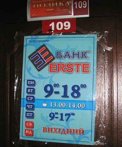В качестве новой завлекающей «фишки» некоторые организации, выдающие кредиты или займы, используют в рекламе названия банков. Часто именно это стает решающим фактором при обращении клиента к такой фирме. Человек предполагает, что берет кредит в маленьком филиале банковского учреждения. Одна из таких организаций привлекла мое внимание и под видом клиента я отправилась «получать» деньги в долг. «За програмою B.A.N.K. ERSTE» - гласила надпись на дверях, при этом два первых слова были написаны очень маленьким размером шрифта, и в глаза бросалось только «B.A.N.K. ERSTE».