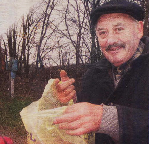 Еду в сторону Гомеля. У дороги, возле ящиков с красивыми краснобокими плодами, — Николай Ларченко. Отец основателя сада Александра Ларченко.