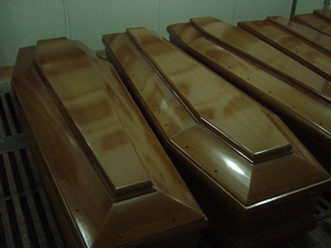 Мы изготовляем их из тополя. Тополь дешевле, чем сосна. Гробы с ручной резкой. Покрываем лаком. Ручки не прикручиваем. Это делают на месте, в России. Не занимаемся обивкой тканью — очень хмурое впечатление создает тканевая обивка. Двухстворчатых не делаем.