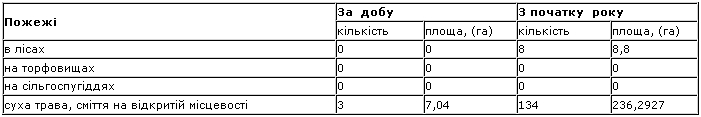 О 16 год. 40 хв. сталася пожежа сухої трави на площі 7 га. Причина - необережне поводження з вогнем невстановленої особи. Збитку не нанесено.