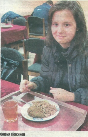 — У нас есть свой буфет, — говорит София Нежинец, студентка музучилища имени Ревуцкого. — Но там только чай и булочки. Так что обедаю здесь. Недорого выходит. Когда очень много закажу — гривен 20. Сегодня 9 гривен (на подносе Софии котлета с гречкой и компот). Больше всего люблю сырный суп.
