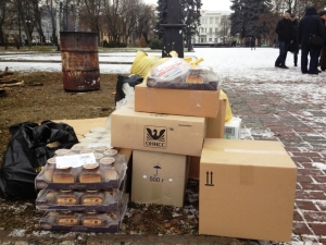 Вже 5 грудня зранку до чернігівських наметів ЄвроМайдану городяни почали зносити продукти харчування та теплий одяг. Допомогти вирішили як звичайні чернігівці - домашньою консервацією, так і підприємці, що привозили цілі ящики чаю, кави, консервів та інших продуктів.