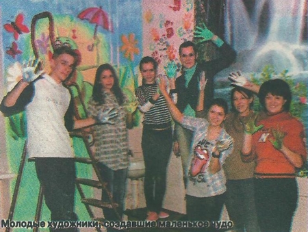 - Члены молодежного парламента города собрали вокруг себя творческих небезразличных учеников и студентов и решили сделать сказку в помещении, где родители навещают своих больных детей. В воскресенье, 15 декабря, воспитанники городской школы искусств и студенты училища культуры разрисовали стены комнаты. Молодых людей собрала вместе местная художница и мастерица Юлия Петренко. Она мастерица Украины, обладательница гранта президента, участница и победительница многих выставок и конкурсов, мастерица по работе с солёным тестом. Вместе со своими учениками она работала целый день.