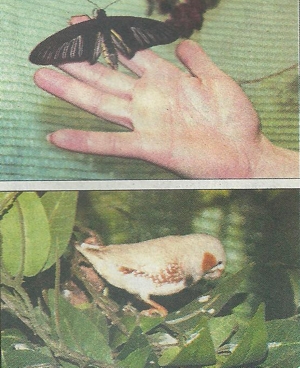 Дружню компанію лускокрилим комахам складають різнокольорові «співуни» амадини - це, до речі, єдині птахи, що не полюють на метеликів. Навпаки - змушують їх рухатися і демонструвати свою красу відвідувачам. Тож таке товариство неабияк тішить і дітей, і дорослих.