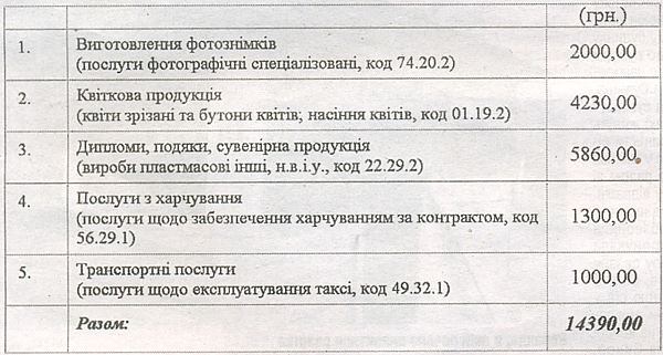 24 грудня у Чернігові вітали переможців обласного конкурсу «Благодійник року-2013». Привітання обійшлися ОДА більш ніж у 14 тисяч гривень. На що їх витратили, значиться на офіційному сайті ОДА (див. таблицю):