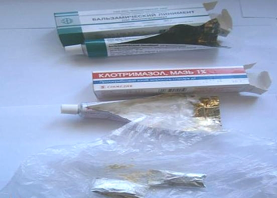 При выдаче почтовой посылки, поступившей осужденному, в тубах медицинских препаратов, а именно в противогрибковым средством «Клотримазол» и противовоспалительным дезинфицирующем средстве «Бальзамический линимент» было обнаружено и изъято 2 свертка с порошкообразным веществом белого цвета предварительно завернутые в полиэтиленовую пленку и обернуты скотчем.