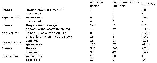 О 05:50 09.04.2014 р. сталася пожежа житлового будинку. Вогнем знищено покрівлю, пошкоджено стіни. Ймовірна причина - необережність під час куріння онука господарки 1983 р.н., тіло якого виявлено на місці пожежі. Збиток - 10 000 грн. Врятовано матеріальних цінностей на суму 7 000 грн.