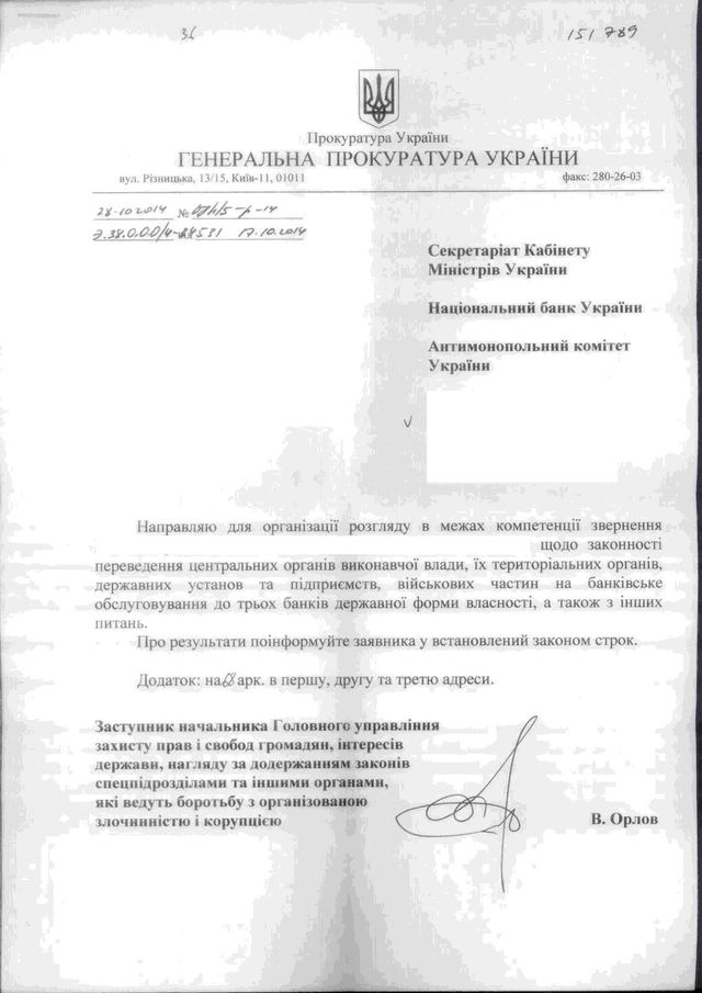 Об этом говориться в письме Генеральной прокуратуры, подписанном заместителем начальника Главного “антикоррупционного” управления Владимиром Орловым. Соответствующие поручения о проверке законности решений Кабмина о переводе бюджетников в госбанки направлены в Секретариат правительства, Антимонопольный комитет и Национальный банк Украины.