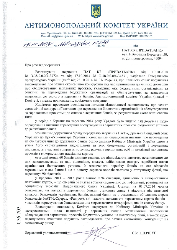 Антимонопольный комитет Украины обратился к правительству с требованием обеспечить соблюдение действующего законодательства о защите экономической конкуренции на рынке банковского обслуживания госпредприятий и их сотрудников. Как говорится в письме, подписанном государственным уполномоченным Комитета Сергеем Шершуном, ряд действий правительства, направленных на принудительный перевод бюджетников в государственные банки, не только противоречат Закону, но и могут создать препятствия для свободного доступа людей к личным средствам.