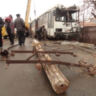 В результате ДТП поврежден автобус, были оборваны электрические провода, повреждена троллея, сломан забор. На месте работают бригады ремонтников ТТУ и электриков. Движение трамваев остановлено. 10 домов в районе аварии на данный момент обесточены.
