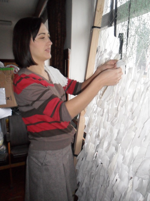 Прежний актовый зал – официальный, казенный – сейчас на себя не похож. Возле трибуны для выступающих высится гора старых простыней. Кругом на сидениях — сумки с материалами, на сиденьях непосредственно лежат разорванное на ленточки тряпьё. А у окна стоит огромная деревянная рама — на ней растянута зеленоватая волоконная сеть. И именно на ее ячейки волонтеры и цепляют белые ленты-тряпочки. Получается что-то вроде ленточного покрывала. Легкого, полупрозрачного. От дождя не защитит, а вот технику укроет вполне.