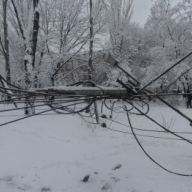 Обрушившийся фонарь, удерживается на проводах и остатках арматуры разрушенного столба.