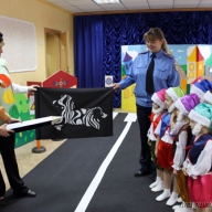 Старшие группы выступили перед малышами с постановочной сценкой. В игровой форме продемонстрировали правила ПДД, которые должен знать каждый для обеспечения своей безопасности на проезжей части. Показали инсценированную школу Правил дорожного движения, где обучали малышей, как правильно переходить дорогу. После чего малыши сами нарисовали дорожные знаки и пояснили их значение.