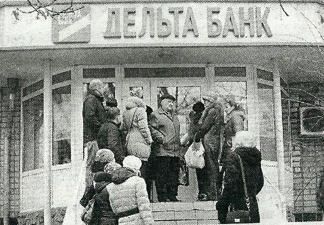 А щодо черг за грошима, то це окрема розповідь. Бачила їх на власні очі. Вкладники-оптимісти жартують, що останнього разу стояли в такій черзі, коли у Мавзолеї хотіли побачити Леніна. А ось пенсіонери, буває, стають у чергу за кілька годин до відкриття банківської установи і мерзнуть на вулиці. А які емоції там вирують! Люди плачуть, нервуються, лаються, клянуть банківську систему. До речі, вкладники повідомили, що поспілкуватися з керівником відділення «Дельта Банку», що на вулиці Мстиславській, практично неможливо. Банківські працівники почасти відповідають, що її немає на роботі, і на прийом треба записуватися(І).