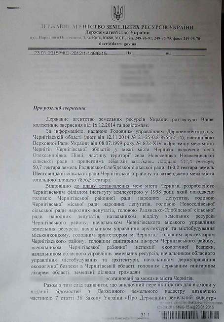 По словам Юрия Титаренко, проблемы с территориальной принадлежностью есть у жителей всех присоединенных к Чернигову сел, чьи участки находились на границах установленной в 1998 году городской черты. Добавим, что план установления границ Чернигова разрабатывался Черниговским филиалом института землеустройства в 1998 году. После этого прошел целую вереницу чиновничьих кабинетов, где прошел процедуру согласования. Документ согласован председателем Черниговского районного совета народных депутатов, председателем Черниговского городского совета народных депутатов, председателем Новоселовского сельского совета народных депутатов, председателем Советско-Слободской сельского совета народных депутатов, начальником отдела земельных ресурсов Черниговского района, начальником Черниговского городского управления земельных ресурсов, начальником управления архитектуры и градостроительства горисполкома, главным архитектором Чернигова, главным архитектором Черниговского района, главным санитарным врачом Черниговского района, начальником Черниговского районного инспекции экологической безопасности, начальником областного управления земельных ресурсов, начальником областного управления градостроительства и архитектуры, начальником госуправления экологической безопасности в Черниговской области, главным государственным санитарным врачом области.