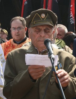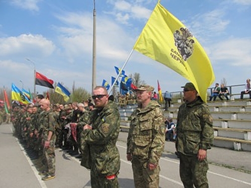 «…до останньої краплі крові, до останнього подиху вірою і правдою служити Україні», – в унісон повторюють добровольці слова Присяги, яку зачитав 90-річний член ОУН і вояк УПА, один з керівників Кенгірського повстання Володимир Караташ.