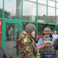 Дворник ТЦ "Обжоры" Любовь рассказала, что приблизительно в 8:20 неизвестные в форме люди выскочили из микроавтобуса, ворвались в магазин и не пускали сотрудников внутрь. Любовь сообщила, что парковщик Николай вызвал милицию или военную комендатуру. Приехавшие оперативники вывели "под руки" ранее ворвавшихся в магазин людей в форме.