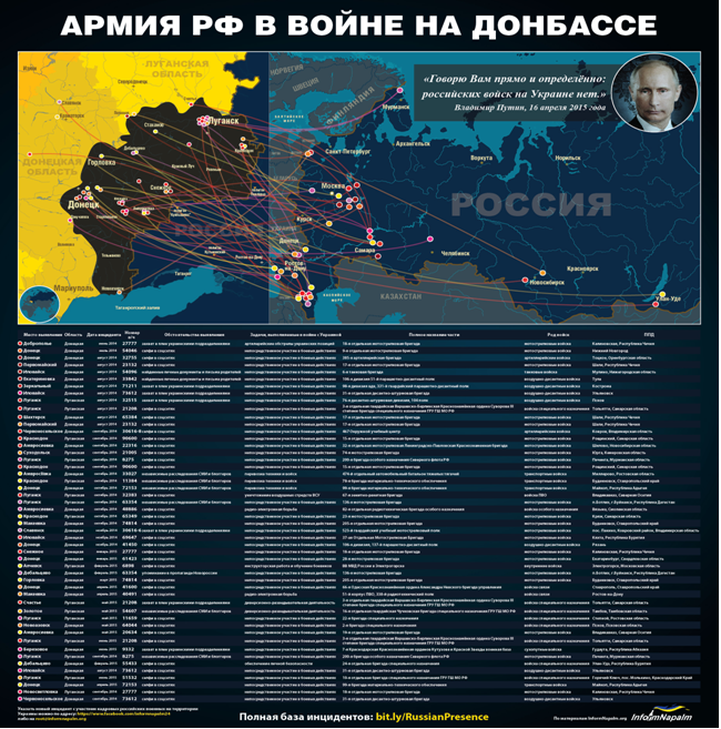 Активисты сайта "InformNapalm", который отслеживает пребывания российских войск в Донбассе, объединили все зафиксированные случаи в единой карте и опубликовали ее в свободном доступе. На карте видно, какие именно подразделения войск России находились или до сих пор в Украине, где фиксировали случаи их пребывания и обстоятельства обнаружения военных агрессора в Украине. К пояснению к карте InformNapalm прикрепил ссылки на базы данных, в которых собрана информация о воинских частях ВС РФ, принимающих участие в войне на Донбассе и все доказанные случаи, в которых кадровые российские военные применяли оружие против армии Украины и ее мирных граждан.